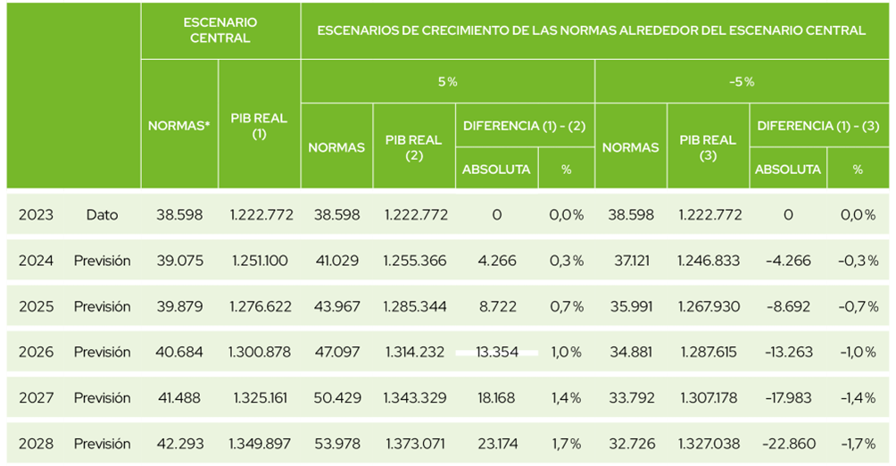 Escenarios de previsión del PIB real en función del crecimiento de las normas de +5% y -5%