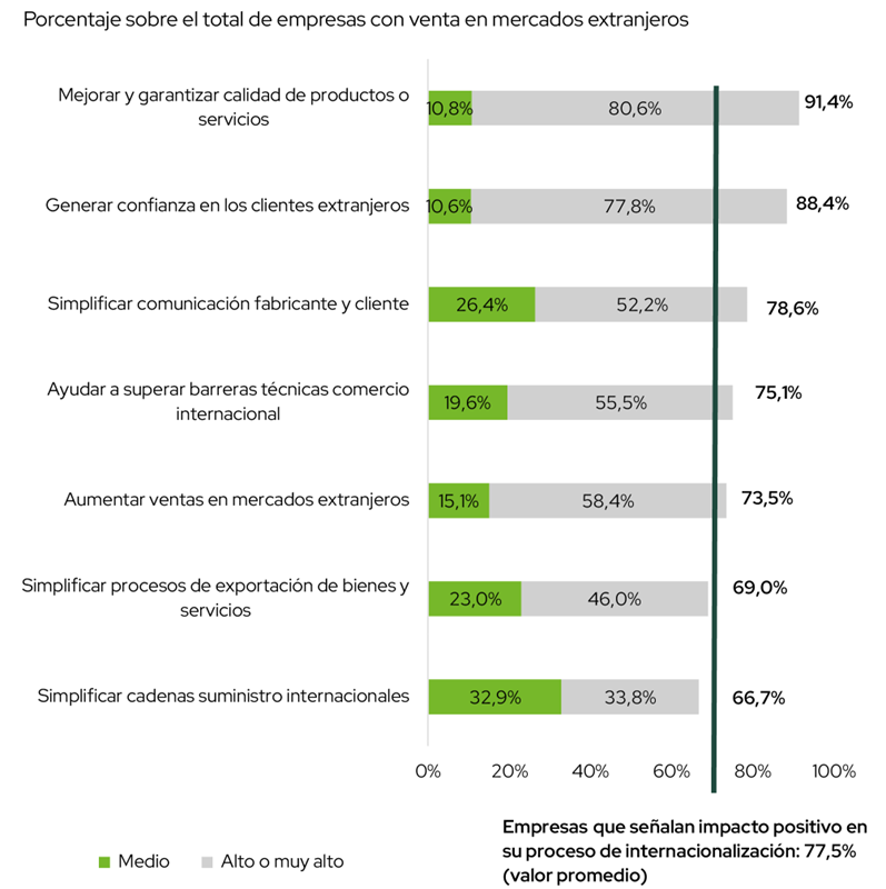 Según este sondeo, más del 90 % de las empresas exportadoras afirman haber mejorado la calidad y garantía de sus productos gracias a la aplicación de las normas y el 58,4 % consideran que la aplicación de los estándares ha tenido un impacto alto o muy alto en la mejora de sus ventas en los mercados internacionales.