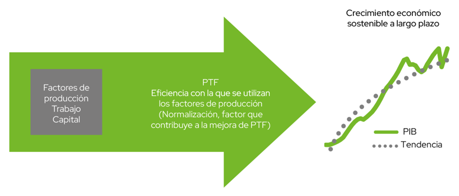 Representación de las relaciones entre los factores de producción, la PTF y el crecimiento económico del modelo Cobb-Douglas
